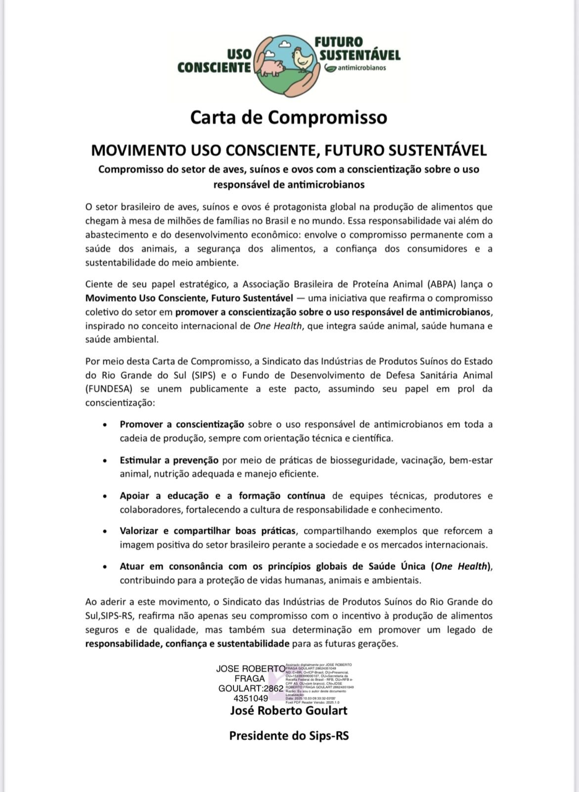A Carta de Compromisso “Uso Consciente, Futuro Sustentável” é o documento oficial do movimento. Ao assiná-la, organizações se unem publicamente a este pacto pela promoção da conscientização em prol da saúde única, pela segurança alimentar e pela sustentabilidade da produção.